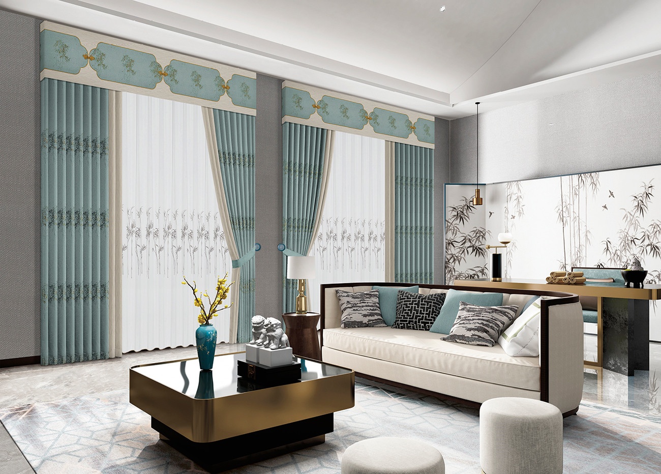 簡(jiǎn)約的摩登新中式,還原簡(jiǎn)樸寧?kù)o之美。天青色的主布舒適雅致,帶著高潔氣韻的竹子圖案平添一份恰到好處的典雅,彰顯優(yōu)雅時(shí)尚的新中輕奢范。