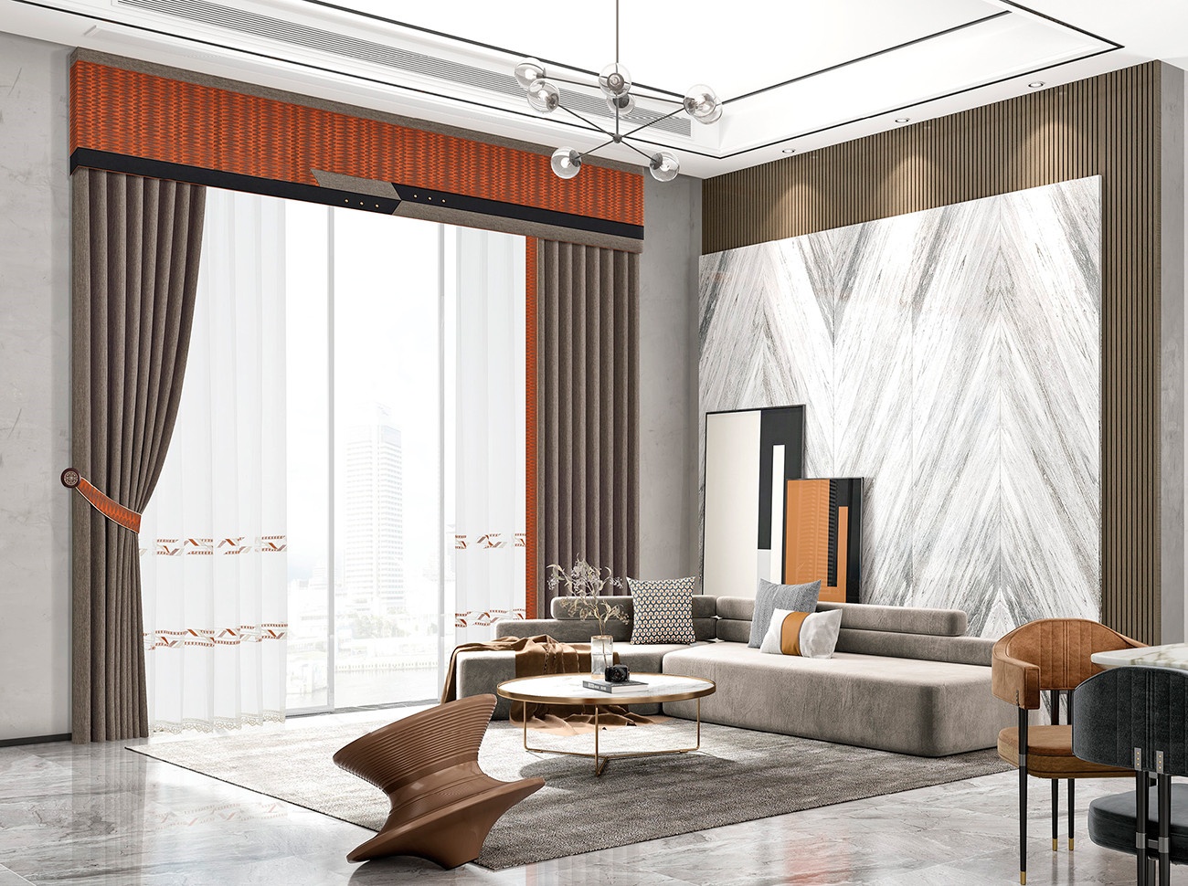 奢雅視感的窗簾,配合簾頭干凈流暢的線條、簡約而不簡單的造型,帶來視覺上的舒適平整,展現(xiàn)出時尚審美與經(jīng)濟需求結(jié)合的奢雅設計。高級配色濃烈醇厚,如一場華麗的探戈,輕而易舉演繹出時尚、現(xiàn)代、摩登的生活空間。