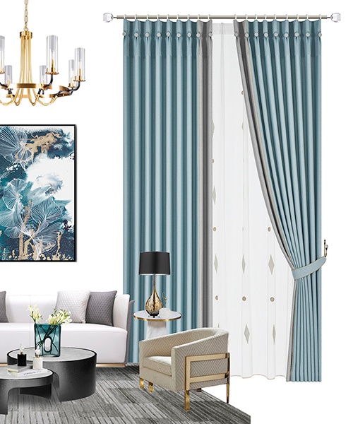 現(xiàn)代簡約的素凈表象,潛藏著厚重內(nèi)里。布藝的肌理感賦予灰藍色高級質感,不沾染一絲塵埃的干凈模樣讓空間觀感舒朗起來;簡潔的平幔簾頭,配合簡練的幾何圖案,恰到好處的垂墜感,打造恬然而優(yōu)雅的家居風情。